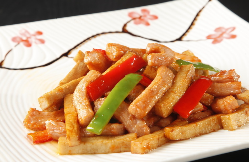 主辅料名称:猪颈肉、杏鲍菇、红椒、黄椒、青椒
